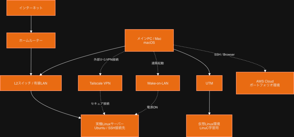 - クラウドの知識を補完するため、オンプレミス(実機)環境での検証も開始。SSH接続、Tailscale(VPN)、Wake-on-LANを組み合わせた、外部ネットワークから安全に操作可能なリモート管理基盤の構築。実務レベルでのリモート運用環境を再現。