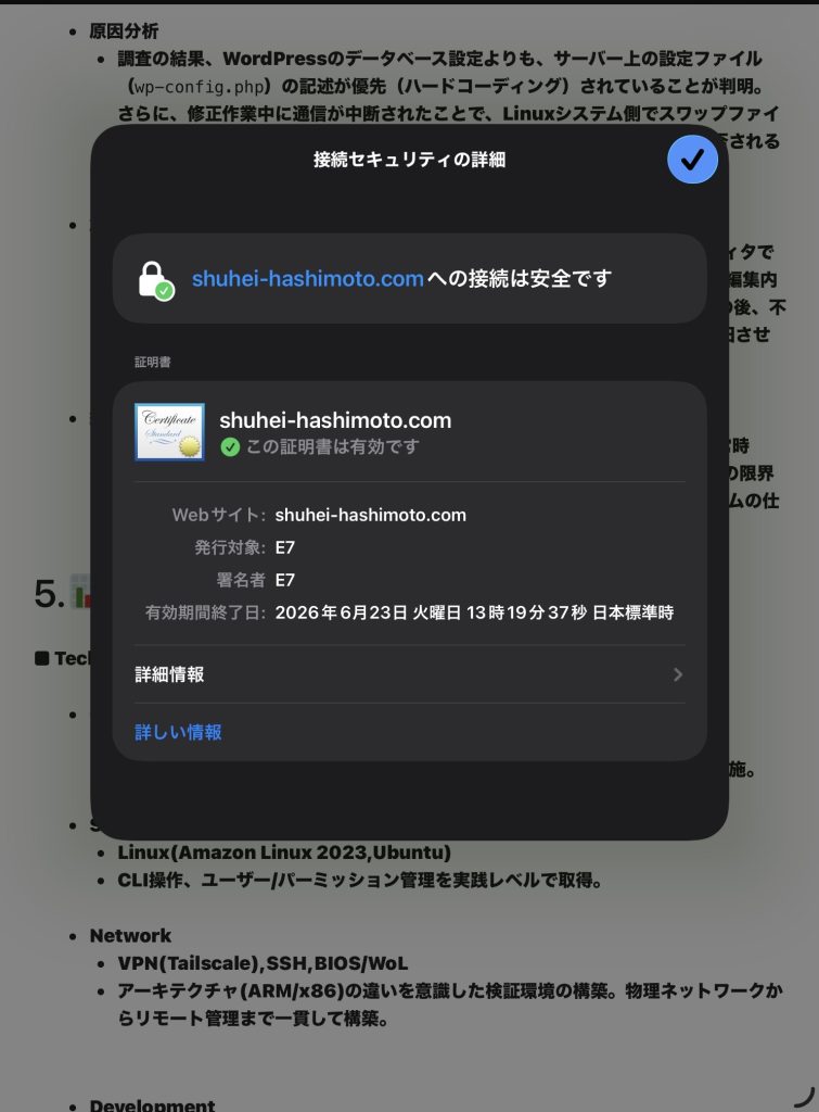 - 「URLが正しく繋がらない」という不完全な状態を許容せず、あるべき姿(常時SSL化)を追求した結果、ブラウザの「南京錠 🔒」マークを達成。GUIの限界をCUI(コマンド操作)で突破する実務能力と、Linuxのファイル管理システムの仕組みを深く理解することができた。